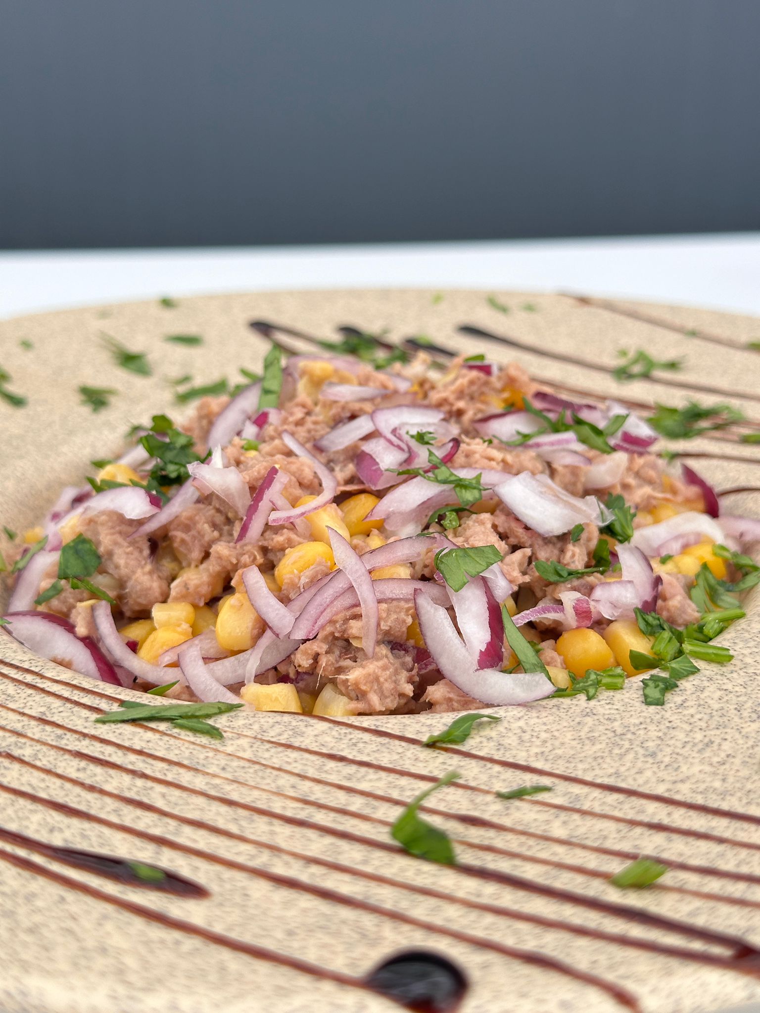 Salată nutritivă cu ton proaspăt, legume diverse și un dressing echilibrat, care aduce savoare și energie. O alegere excelentă pentru o masă ușoară și hrănitoare.