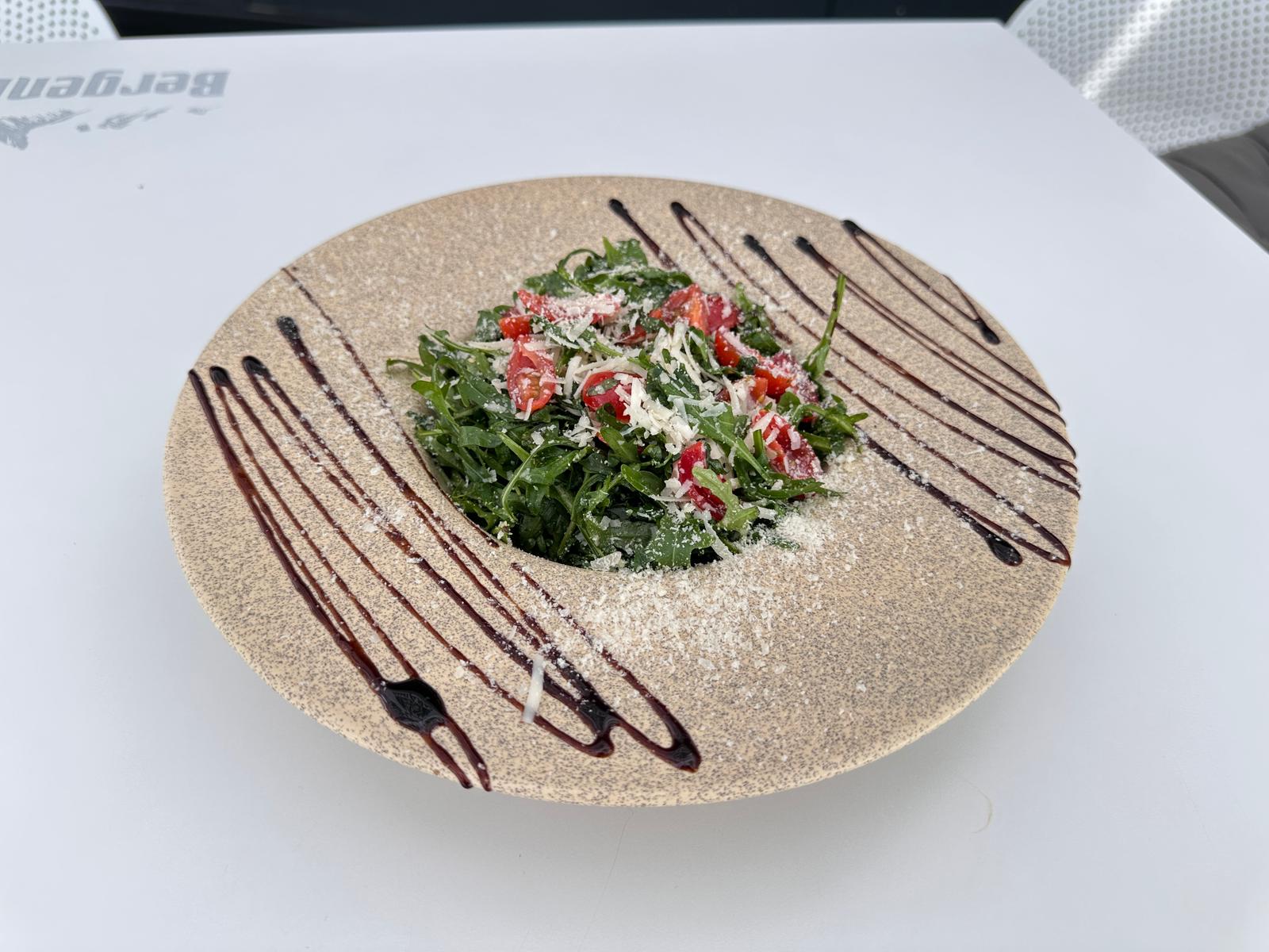 Parmezan: 120g, rucola 130 g , : ulei masline 50g , Rosii cherry: 50g , Crema de otet balsamic: 20g