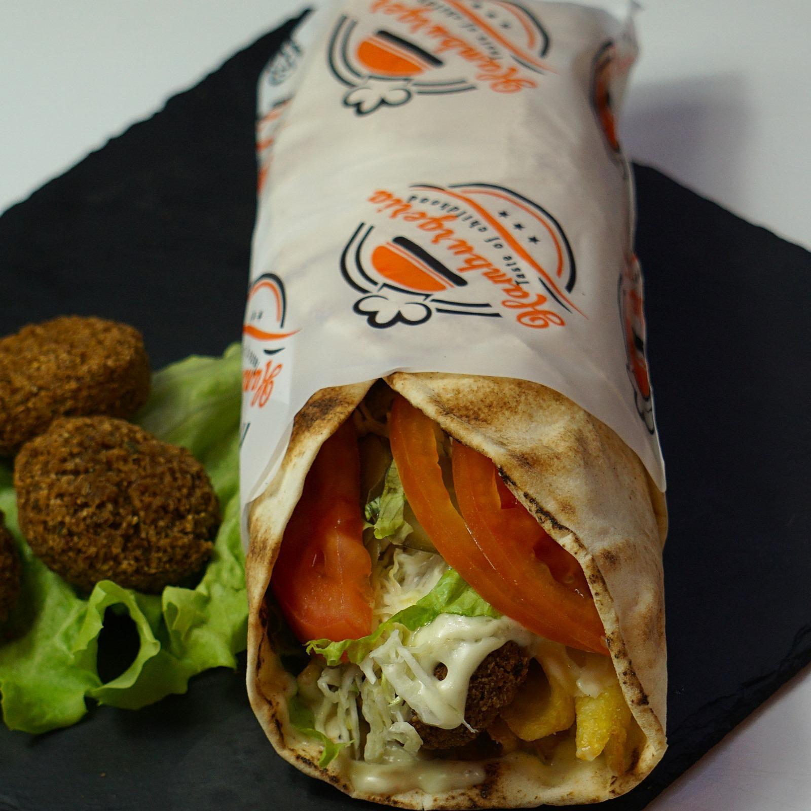 Opțiune vegetariană cu falafel crocant și sosuri speciale.